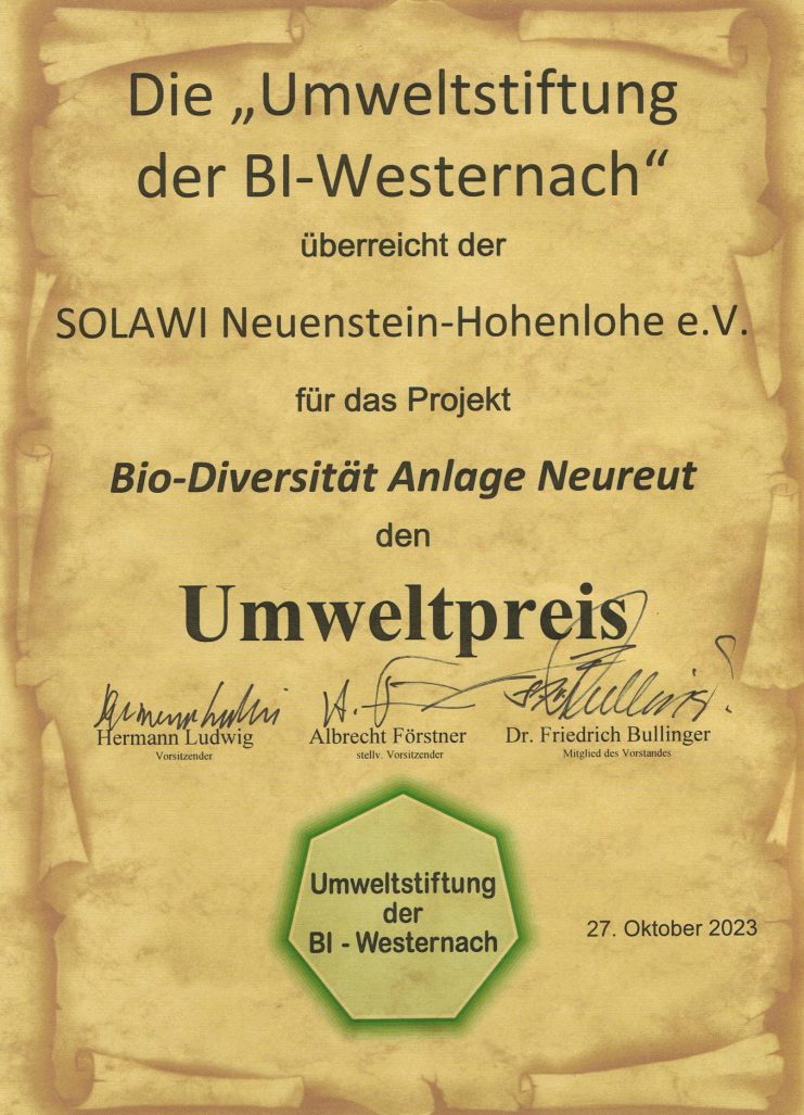 Wir haben den Umweltpreis der Umweltstiftung der BI-Westernach erhalten
