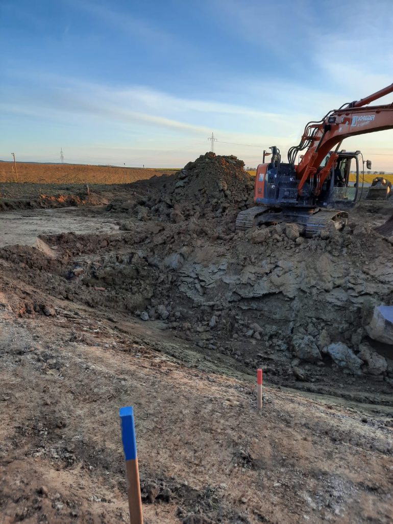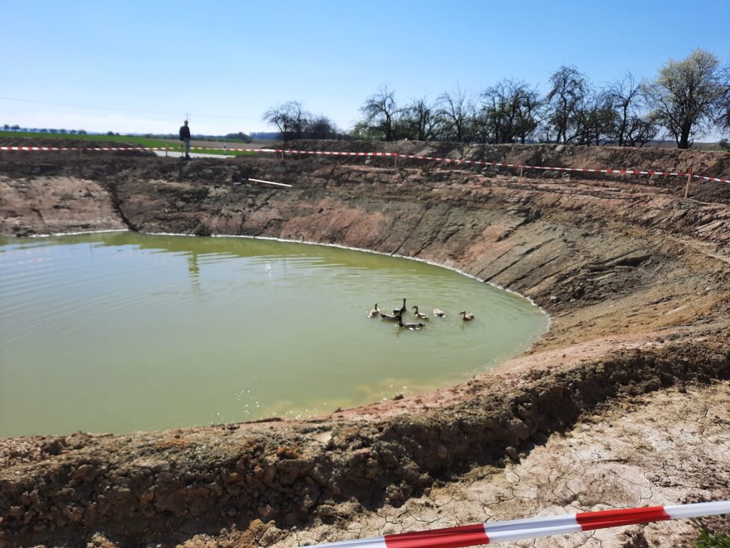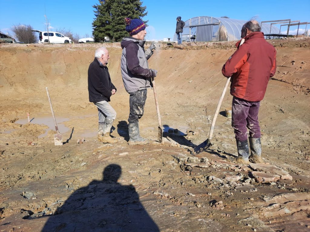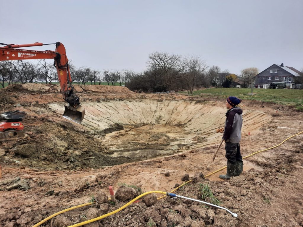 Im März haben wir unsere Bewässerungsteich ohne Folie angelegt. Durch den lehmigen Boden und die fleißige Unterstützung der Mitglieder konnte der Teichboden wasserdicht gestampft werden. Leider konnte sich durch den trockenen Sommer noch nicht viel Wasser im Teich sammeln und hoffen, dass der Winterniederschlag den Teich füllen wird. Es bleibt spannend! Im Zuge des Teichbaus wurde um das Solawi Grundstück zur Straße hin ein Erdwall aufgeschüttet. Dieser dient als Windbremse und schützt vor Straßenlärm und Abgase.